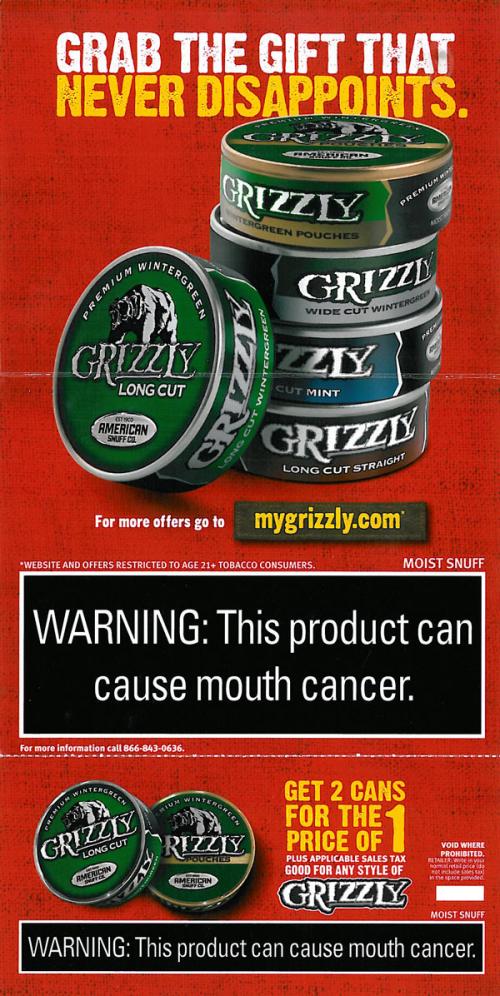 Direct mail received from Grizzly in November 2015 wishing the recipient a happy birthday. Direct mail also contains a coupon for two cans for the price of one. Text: "Grab the gift that never disappoints."