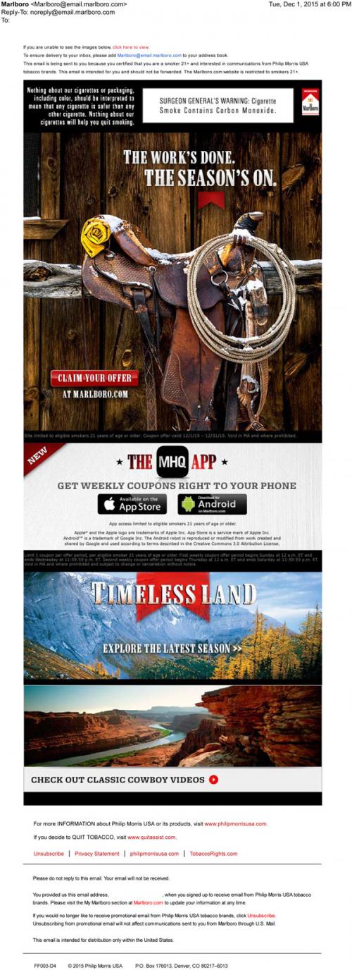 Marlboro email from December 2015 inviting the recipient to claim their monthly coupons on the brand website, and to check out classic cowboy videos and the Timeless Land feature. Also promotes the MHQ app, which sends coupons to a customer's mobile device.
