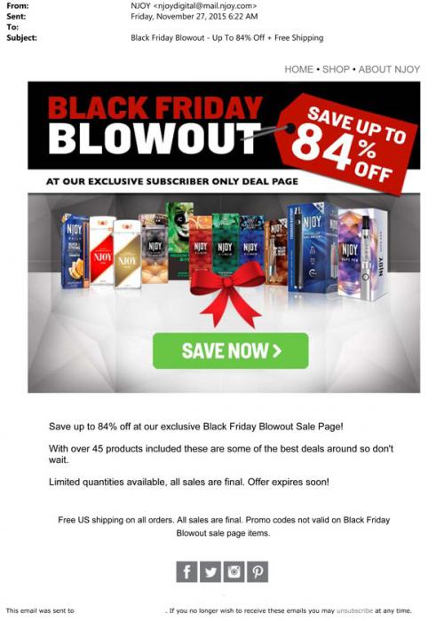 NJOY email in November 2015 promoting their Black Friday online sale.