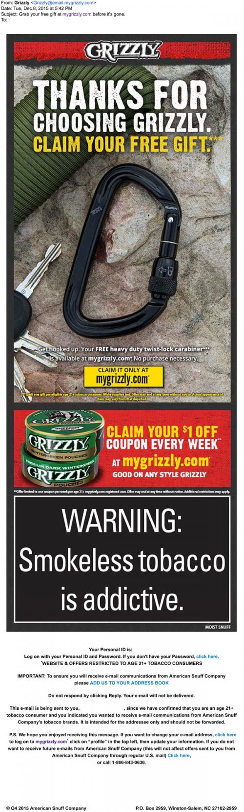 Grizzly email from December 2015 with an offer for a free gift, a carabiner, that can be claimed by visiting the brand website. Also links to available weekly coupons.