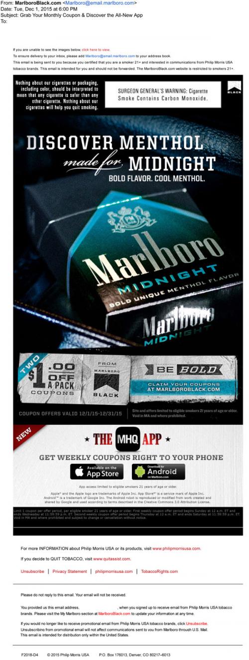 Email from Marlboro Black in December 2015 promoting their Midnight menthol product. Also invites the recipient to claim monthly coupons at the brand website, and to download the MHQ app to get weekly coupons on a mobile phone.