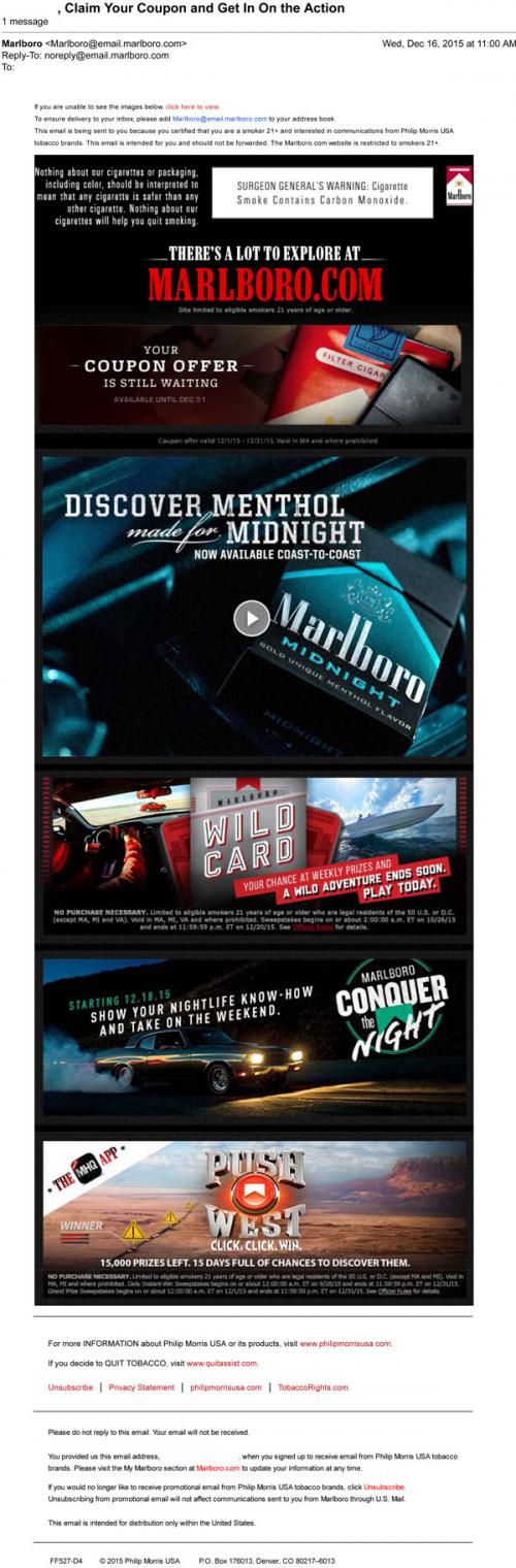 Marlboro email from December 2015 reminding the recipient to claim coupons on the brand website. Also promotes current ongoing sweepstakes, like Wild Card and the Push West app for mobile devices, as well as the interactive nightlife conversation Conquer the Night.