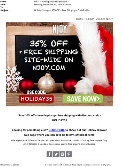NJOY email from December 2015 promoting a site-wide holiday sale where customers can get 35% off their purchase and free shipping with the special discount code.