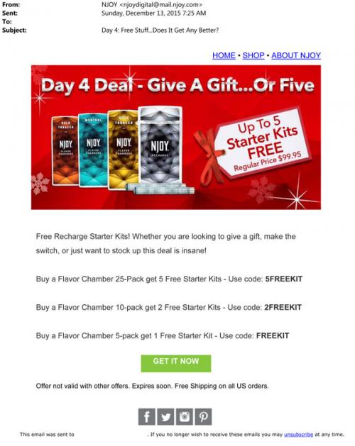 NJOY email from December 2015 offering free rechargeable starter kits with the purchase of flavor chambers on Day 6 of the 12 Deals promotional holiday sale.