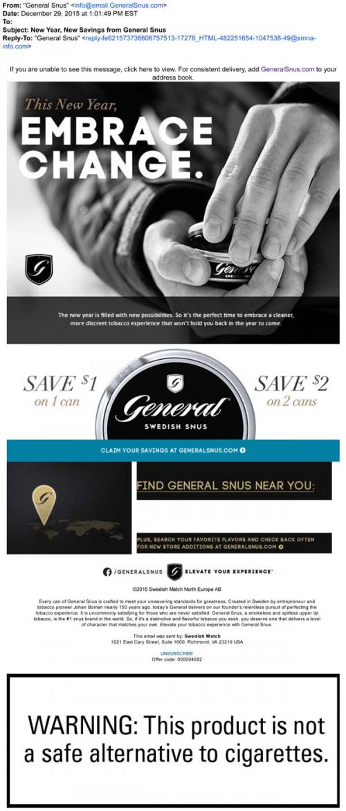 General Snus email from December 2015 promoting the "cleaner, more discreet tobacco experience" from using their products as part of changes to make in the New Year. Also includes links to claim coupons on the brand website or locate retail stores.