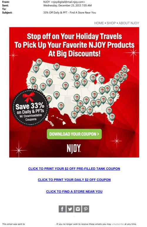Holiday email from NJOY linking to the store locator on their brand website, as well as links to coupons to print.