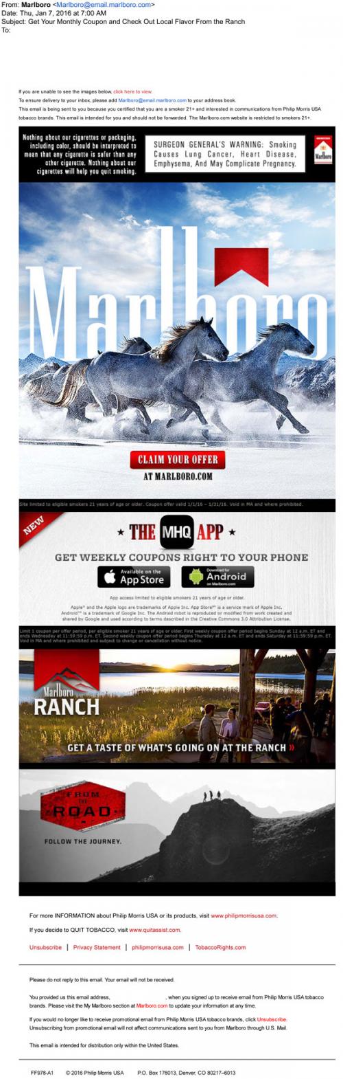 Email from Marlboro in January 2016 linking to claim coupons on the brand website. Also promotes the MHQ app for mobile coupons, links to updates about current events on the Marlboro Ranch, and features the From the Road travel blog.