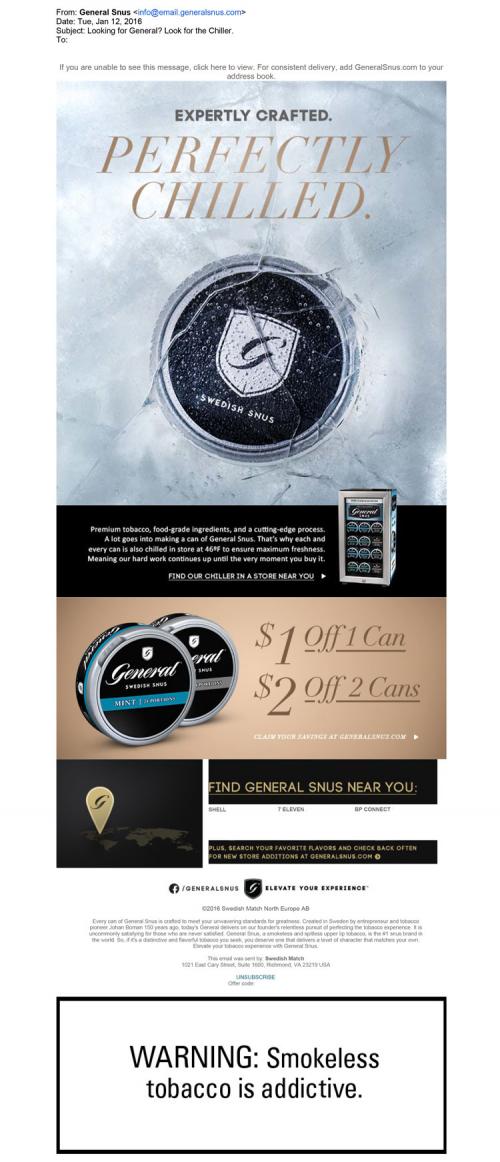 Email received from General Snus on January 12, 2016 promoting "perfectly chilled premium tobacco." The new cans are stored in a mini fridge to maximize freshness. The email provides a link to a store locator for easy convenience. The email also invites the recipient to the brand website to claim their monthly coupons.