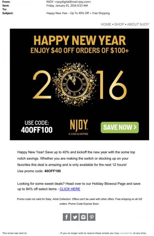 Email from NJOY in January 2016 wishing the recipient a Happy New Year and announcing a sale in celebration.