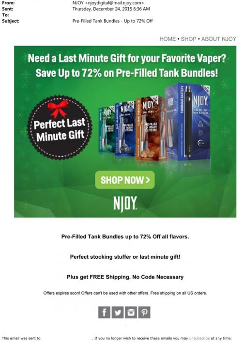 Email from NJOY in December 2015 promoting a sale on pre-filled tank bundles for a "stocking stuffer or last minute gift."