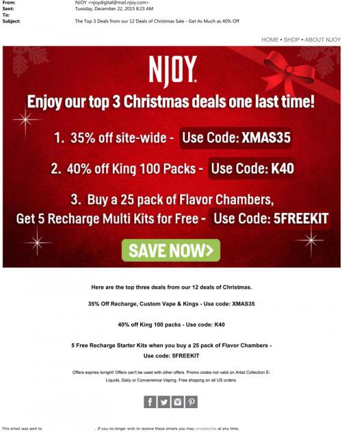 Email from NJOY in December 2015 offering their top 3 Christmas sales from the 12 Deals of Christmas.