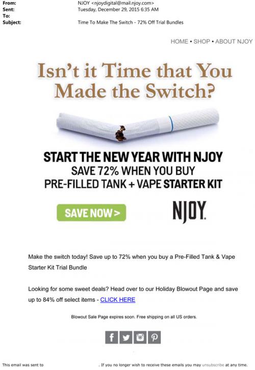 NJOY email from December 2015 promoting a sale on pre-filled tanks and vape starter kits, with reference to making "the switch" from regular cigarettes.