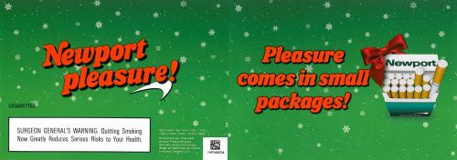 Direct mail from Newport in December 2015 with holiday greetings and containing coupons. Mailing unfolds in the shape of a present. Text: "Pleasure comes in small packages!" and "Unwrap the pleasure for yourself!"