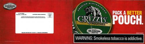 Direct mail received from Grizzly January 2016 promoting their pouch product and containing coupons. Text: "Pack a better pouch. Grab a can today and see why we're America's go-to pouch. Five premium flavors to choose from."