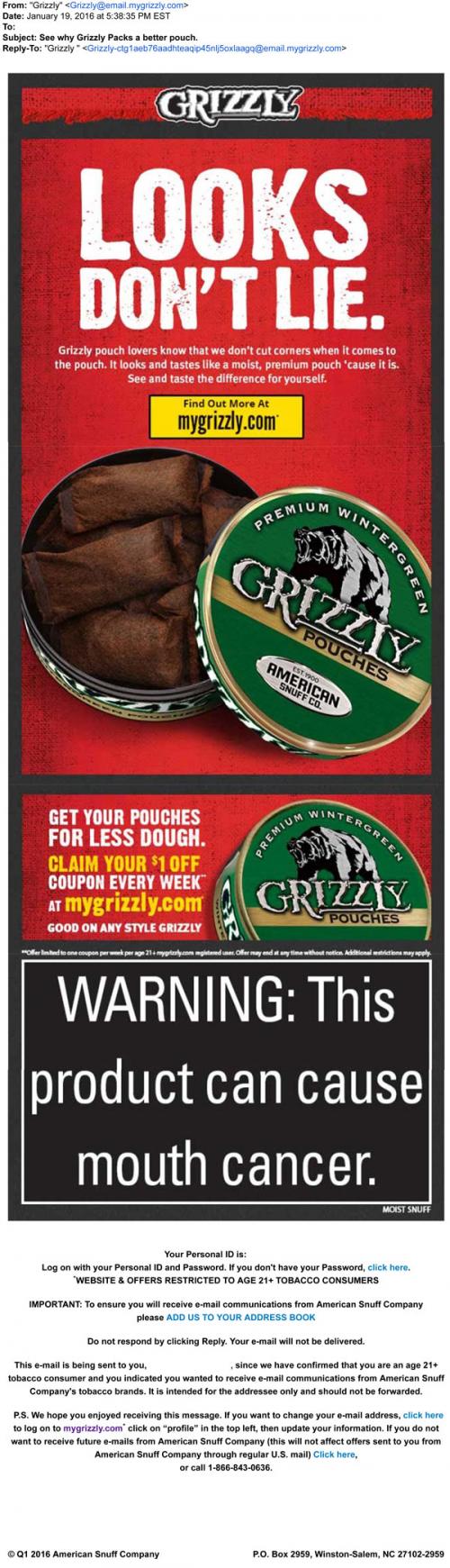 Email from Grizzly in January 2016 promoting the quality of their pouch products. Text: "Looks don't lie."