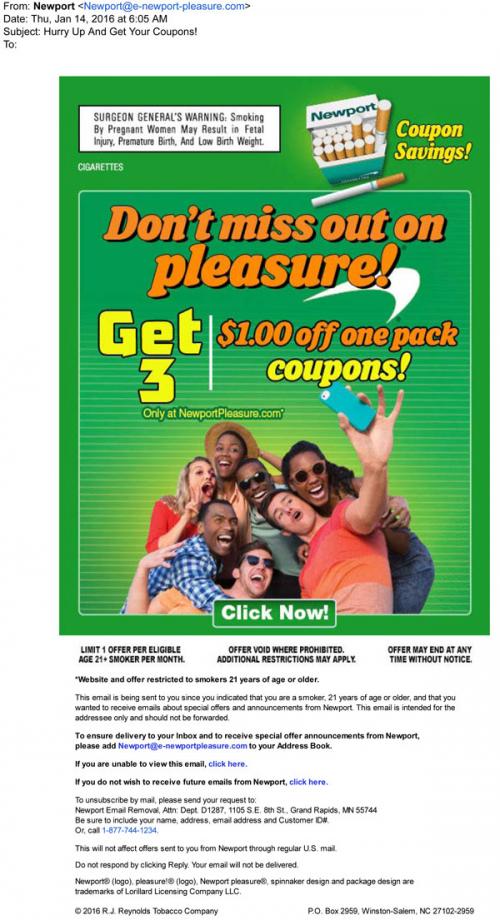 Newport email from January 2016 announcing the chance to claim special coupons on the brand website. Similar to a July 2015 email but contains different URL and information after the company merger of Lorillard by RJ Reynolds. Text: "Don't miss out on pleasure!"