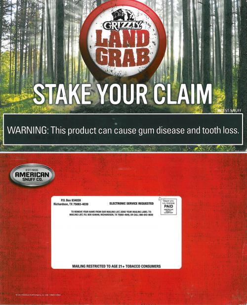 Grizzly direct mail received June 2015 to promote the Land Grab sweepstakes; invites the recipient to "stake your claim" and enter on the brand website. Also includes coupons.
