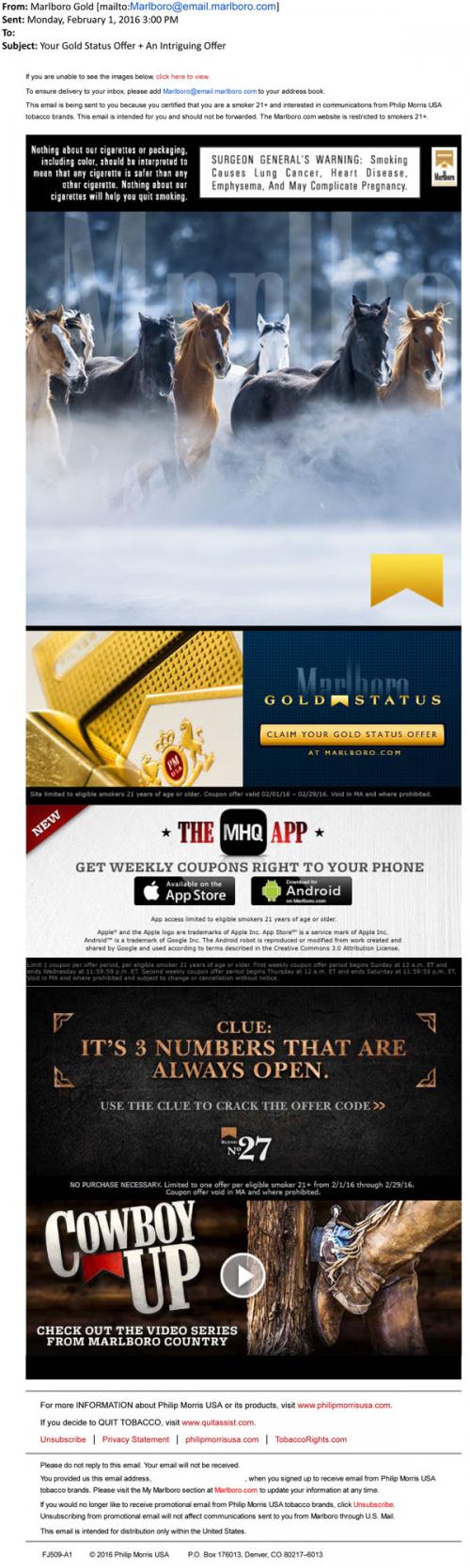 Marlboro Gold email from February 2016 linking to coupons on the