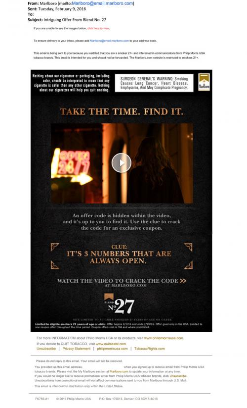 Email received from Marlboro on February 9, 2016 containing an offer for Blend No. 27. A link in the email takes you to the brand website to watch a video for an exclusive coupon code.