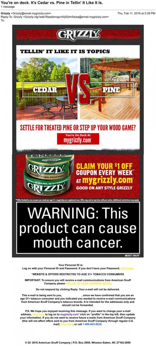 Grizzly email from February 2016 featuring a new "Tellin' it like it is" discussion topic about decks. Also links to the brand website to claim weekly coupons.