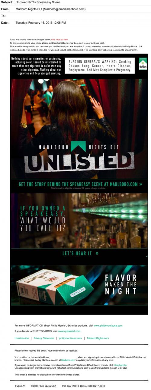 Marlboro email from February 2016 linking to an article on the brand website about the "speakeasy scene" where people can get information about "underground" bars in New York City. Also links to a discussion forum where visitors can post what they would name their own speakeasy.