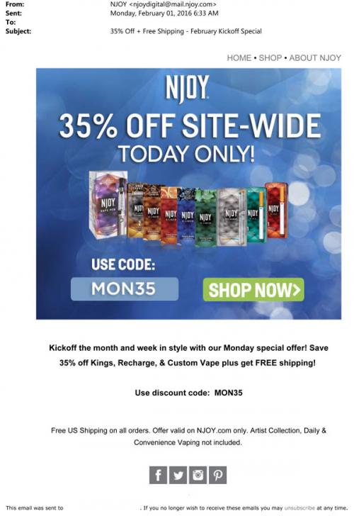 NJOY email from February 2016 announcing a Monday sale to "kickoff the month and week in style." Offers a discount code for use on the brand website.