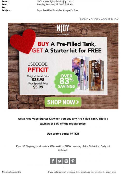 NJOY email offer from February 2016 with a coupon code to get a free starter kit with the purchase of a pre-filled tank on the brand website.