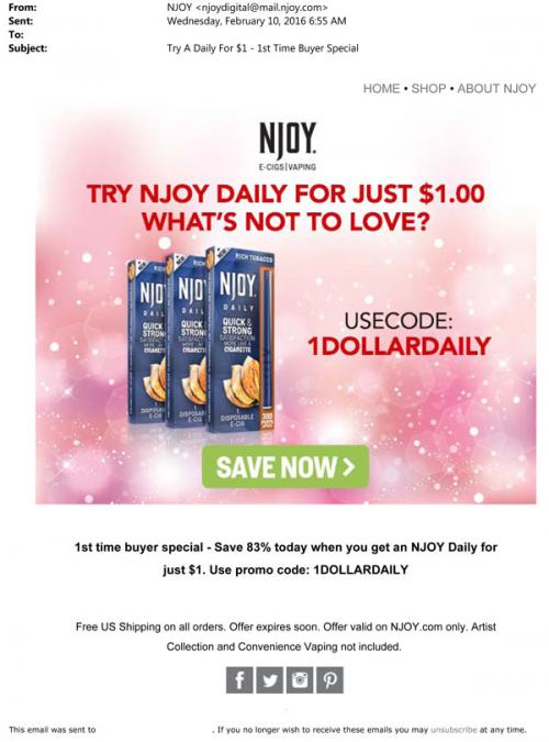 Email offer from NJOY in February 2016 with a coupon code to get a Daily disposable for 1$.