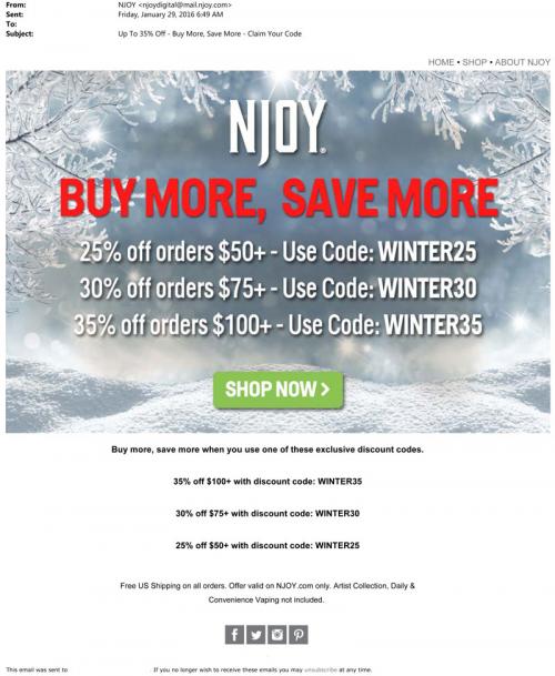 NJOY email from January 2016 with various discount codes to use on the brand website, with a winter theme.