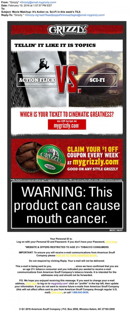 Grizzly email from February 2016 inviting the recipient to participate in a discussion about their preferred movie genre in the "Tellin' it like it is" topic on the brand website. Also links to a weekly coupon to claim.