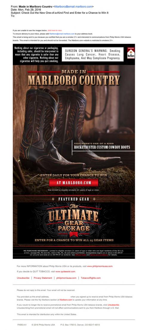 Email received from Marlboro February 29, 2016 reminding the recipient to enter in the Made in Marlboro Country sweepstakes to win this weeks one-of-a-kind custom cowboy boots.