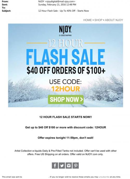NJOY email from February 2016 announcing a 12 hour flash sale on the brand website. The image has a winter theme.