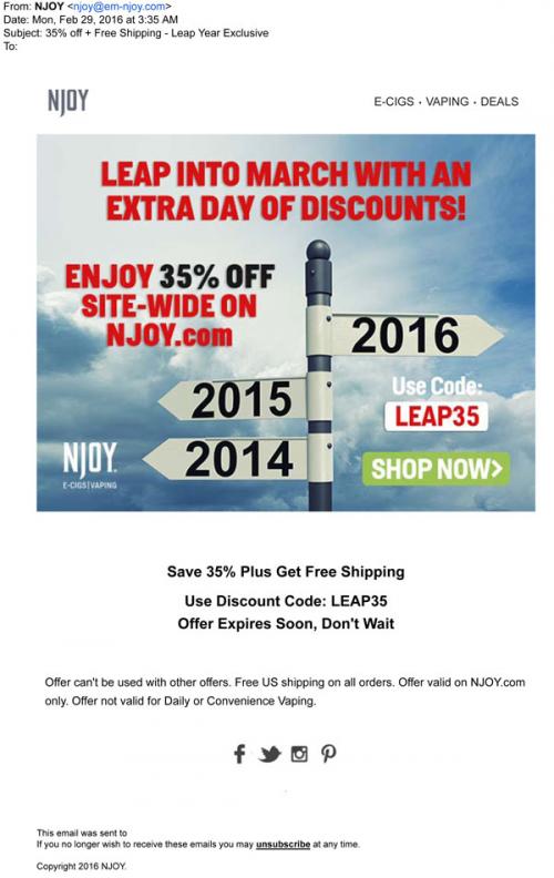 NJOY invites customers to celebrate the leap year with a "Leap into March" sale on the brand website in February 2016.