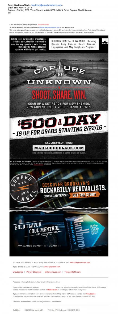 Email received from Marlboro February 18, 2016 informing recipient tat the Capture the Unknown sweepstakes is back. Every photo uploaded to the brand website is a chance to win $500. Text: "Shoot. Share. Win." The email also invites the recipient to the brand website to download music from Marlboro Copper Label and discover bold flavor with Marlboro Midnight.