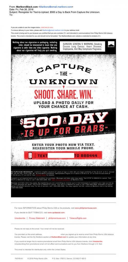 Email received from Marlboro Black February 26, 2016 inviting recipient to register for their mobile phone. By registering, recipient can text their photo to enter the Capture the Unknown sweeps and a chance to win $500.