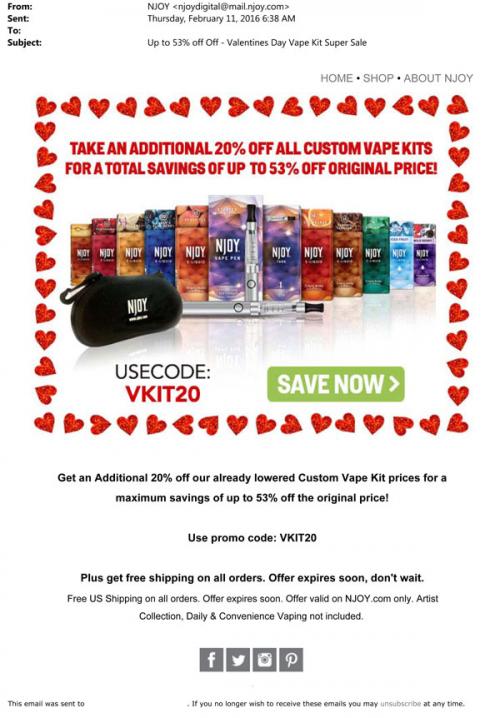 NJOY email from February 2016 with a Valentine's Day themed sale on custom vape kits.