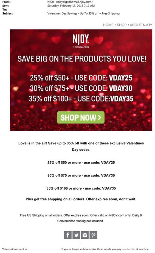 NJOY email from February 2016 with a Valentine's Day themed sale on the brand website.