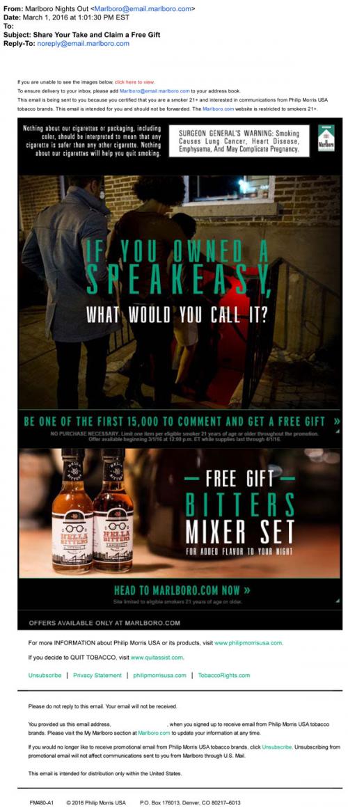 Marlboro email from March 2016 with an invitation to comment on the brand website about what you would call your speakeasy. The first 15,000 to comment would receive a set of bitters mixers for their home bar.