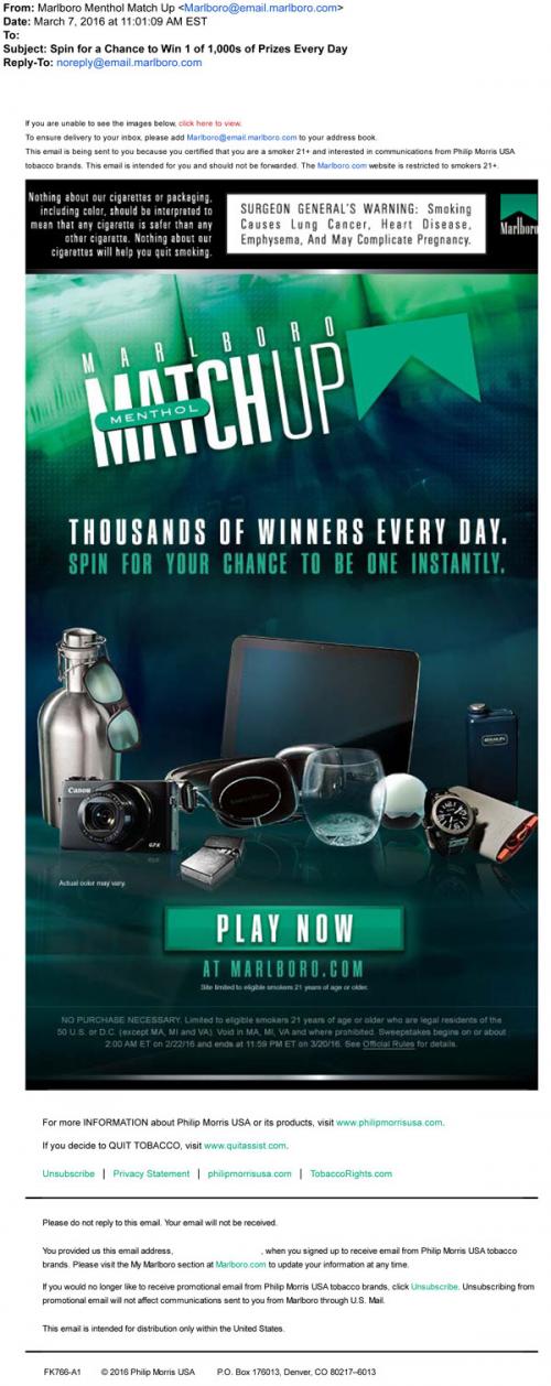 Marlboro email from March 2016 promoting the Menthol Match Up with a promise of "thousands of winners every day" and a link to the brand website to enter.