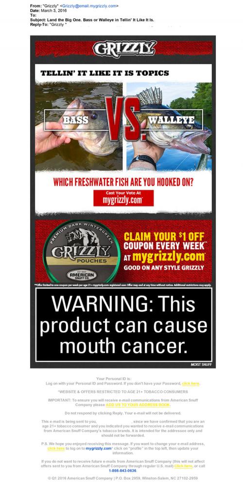 Grizzly email from March 2016 inviting the recipient to discuss, "which freshwater fish are you hooked on?" in the "Tellin' it like it is" topic on the brand website. Links to claim a weekly coupon as well.