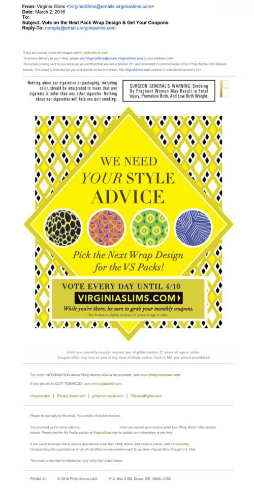 Virginia Slims email March 2016 asking the recipient for style advice. When recipients visit the brand website they can vote for their favorite design for the next pack wrap coupons. Also on the brand website they can request monthly coupons to be sent through the mail.