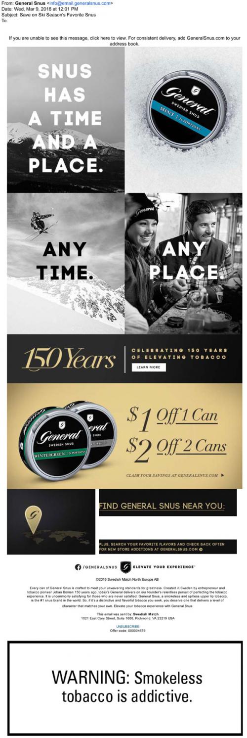 General Snus email from March 2016 promoting their products as "Ski Season's favorite snus." They are also celebrating 150 years of business on the brand website, and links to coupons to claim. Includes retail locations near the recipient. The ad copy continues to push their products as something that can be used anywhere. Text: "Snus has a time and a place. Any time. Any place."