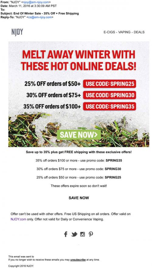 NJOY email from March 2016 suggests the recipient "melt away winter with these hot online deals" and includes various discount codes for use on the brand website.