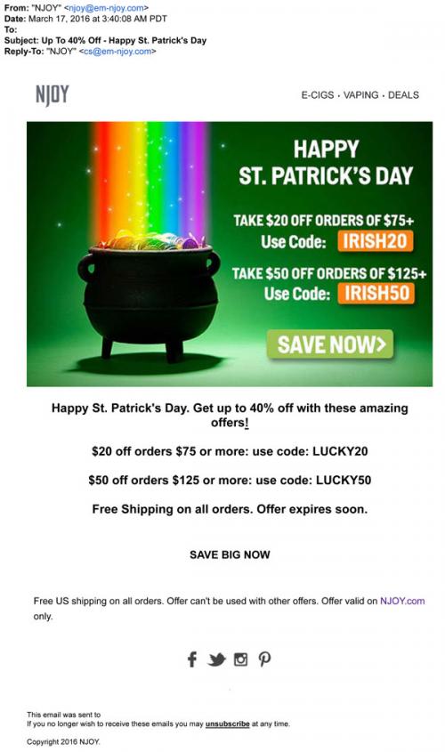 NJOY email from March 2016 announcing a sale on the brand website for St. Patrick's Day.