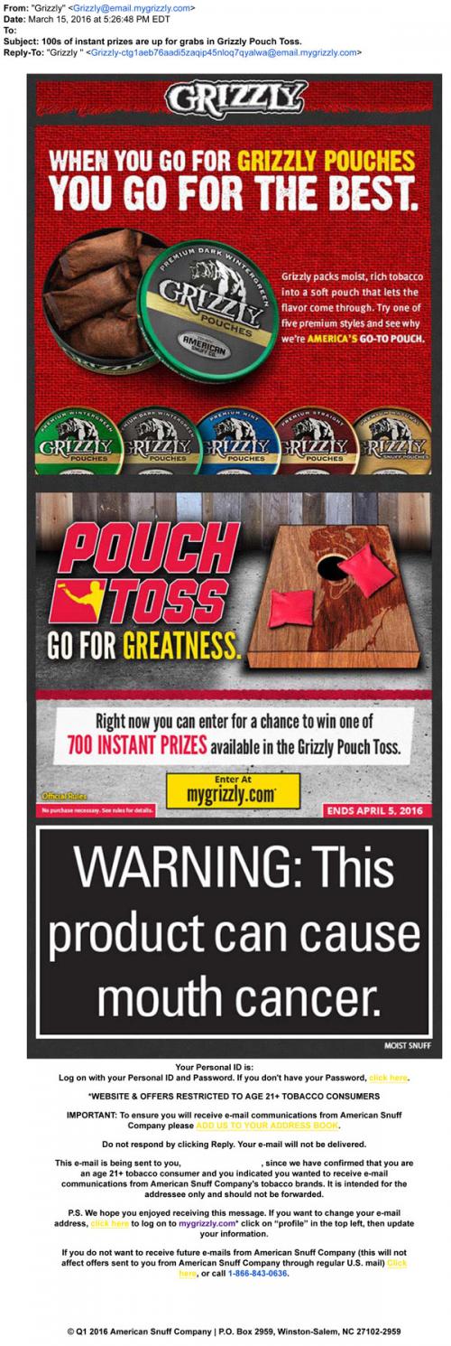 Email from Grizzly in March 2016 promoting their pouch products and the Pouch Toss sweepstakes. Links to the brand website to enter.