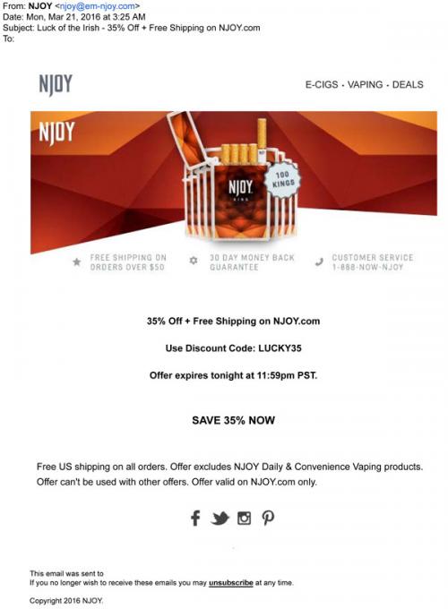 NJOY email from March 2016 promoting a limited sale on the brand website, including free shipping.