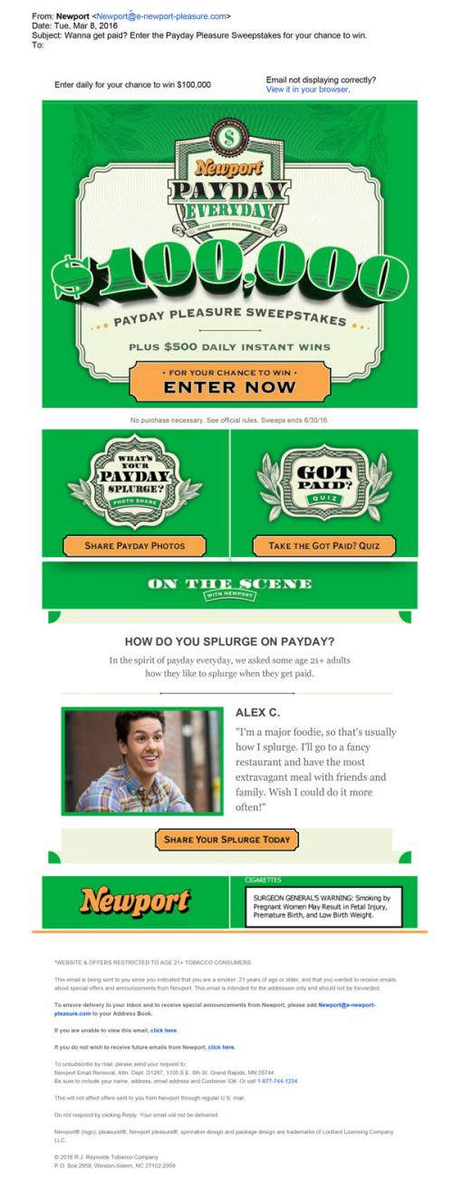 Email received from Newport promoting the Pay Pleasure Sweepstakes. The email also invites the recipient to the brand website to share photos of their payday splurge and take the "got paid?" quiz. The email features Alex C. and his story of his payday splurge.