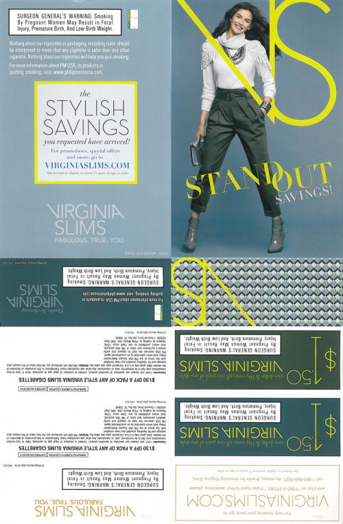 Direct mail received April 2016 from Virginia Slims offering "stand out savings" in the form of coupons. Also promotes visiting the brand website for more special offers.