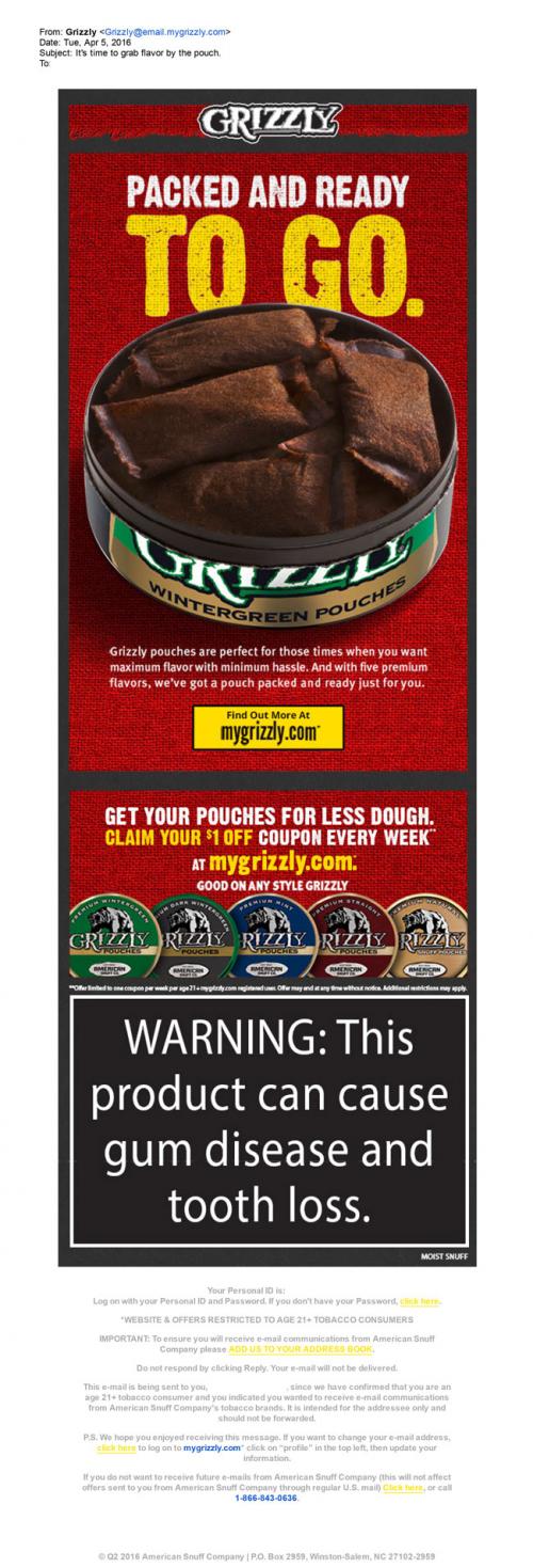 Email received from Grizzly April 2016 promoting wintergreen pouch products. The email also invites recipient to the brand website to claim a coupon every week. Text: "Packed and ready to go."