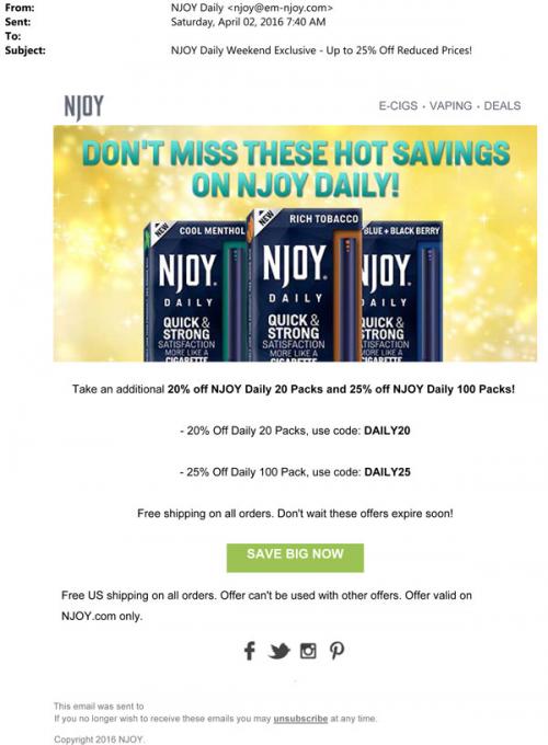 NJOY email from April 2016 with various discounts off multiple packs of their Daily product.